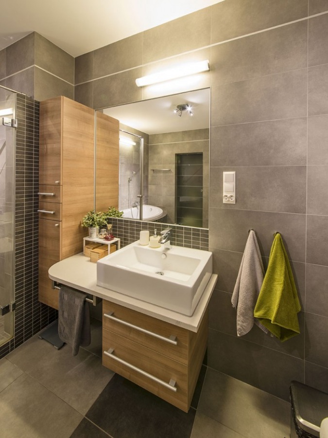 Prezentujemy tutaj zdjęcia z realizacji projektu łazienki utrzymanej w kolorach szarości i grafitu. Całość ocieplona drewnem w połączeniu z elementami chromowanymi i bielą dodaje jej dyskretnej elegancji i sprawia, że na pozór ciemna łazienka jest bardziej przytulna niż zimna.
